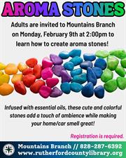 Adults are invited to Mountains Branch on Monday, February 9th at 2:00pm to learn how to create aroma stones! Infused with essential oils, these cute and colorful stones add a touch of ambiance while making your home or car smell great! Registration is required.