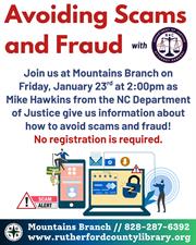 Join us at Mountains Branch Library on Friday, January 23rd at 2:00 pm as Mike Hawkins from the NC Department of Justice gives us information about how to avoid scams and fraud! No registration is required.