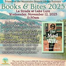 Tickets are $30.00. Reservations are required and must be made at Mountains Branch Library or by calling 828-287-6392. Payment may be made by credit or debit card over the phone. Books will be available for purchase at the event.