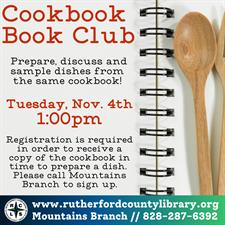 Prepare, discuss and sample dishes from the same cookbook! The Cookbook Book Club will meet Tuesday, Nov. 4th at 1:00 pm. Registration is required in order to receive a copy of the cookbook in time to prepare a dish. Please call Mountains Branch to register.
