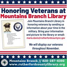 For the month of November, Mountains Branch Library will be honoring our Veterans. Join us by sending us information about your time in the military. Bring your information and picture to the library or email: Maria.davis@rutherfordcountync.gov. We will display our veterans throughout November.