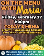 Join us at Mountains Branch on Friday, February 27th at 1:00pm as Maria demonstrates making Creamy Pumpkin and Sausage Soup with Tortellini and Kale. After the demonstration we will be sampling the delicious soup!