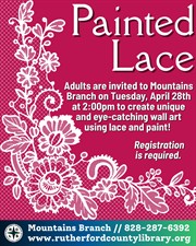 Adults are invited to Mountains Branch on Tuesday, April 28th at 2:00pm to create unique and eye-catching wall art using lace and paint. Registration is required.