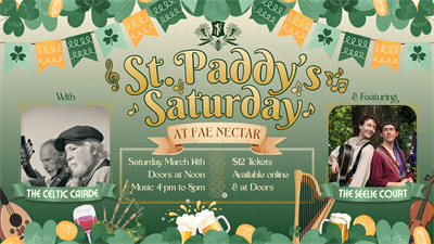 Gather your friends, don your greenest garb, and join us at Fae Nectar Tavern for St. Paddy’s Saturday, a full afternoon and evening of Celtic cheer, music, and merriment on Saturday, March 14th.