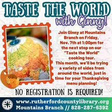 Join Ginny at Mountains Branch on Friday, Nov. 7th at 1:00 pm for the next stop on our "Taste the World" cooking tour. This month, we will be trying a variety of side dishes from around the world, just in time for your Thanksgiving menu planning!