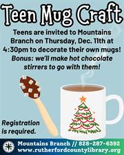 Teens are invited to Mountains Branch on Thursday, Dec. 11th at 4:30 pm to decorate their own mugs! Bonus: we will make hot chocolate stirrers to go with the mugs!